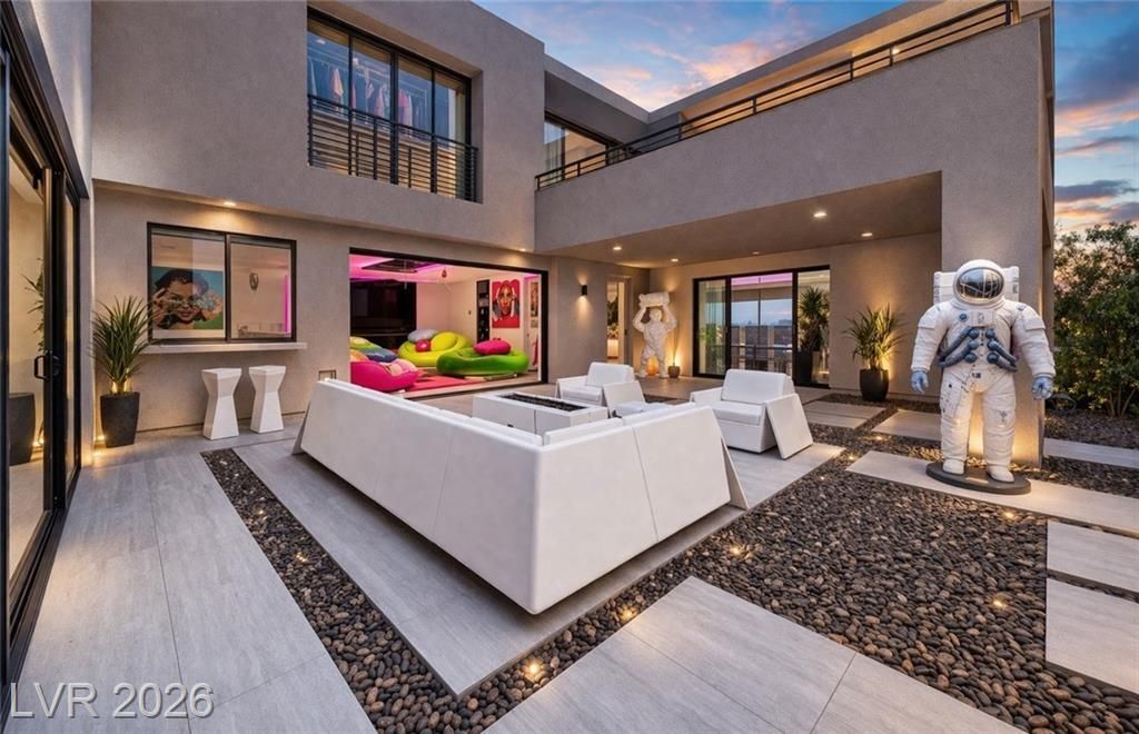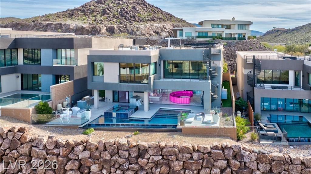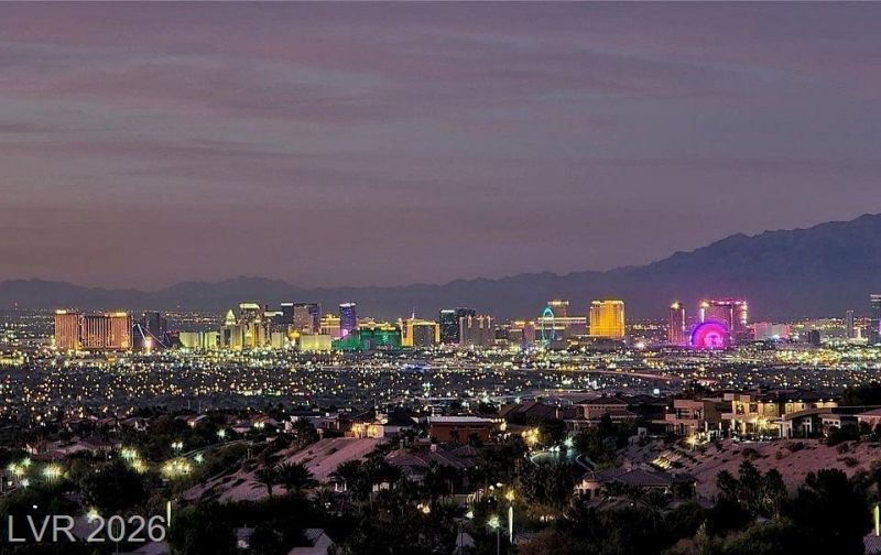 Exceptional fully furnished, turnkey luxury estate offering panoramic Las Vegas Strip views and resort-style amenities. This architecturally distinctive residence features a private elevator, custom integrated lighting, and expansive indoor-outdoor living spaces designed for entertaining. The home includes a dedicated theater room, private salon suite, and thoughtfully curated furnishings. A detached casita provides additional guest accommodations or flexible workspace options.Outdoor amenities include an infinity-edge pool, multiple fire features, and a private courtyard ideal for gatherings. The rooftop terrace offers a built-in barbecue, fire pits, and sweeping Strip views, creating an elevated entertaining experience. Additional highlights include casino-grade high-speed Wi-Fi, owned solar system for energy efficiency, premium finishes throughout. A rare opportunity to lease a highly customized luxury property offering privacy, views, and exceptional amenities in Las Vegas.